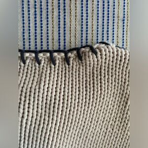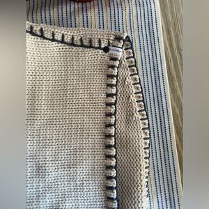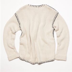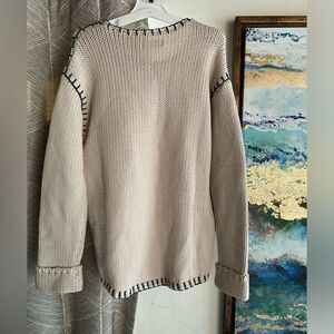 beautiful cream sweater with highlighted seams and dark gray cord to close
