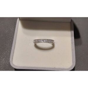 This gorgeous shimmering eternity band ring features a full one carat of small round cut simulated diamonds set in a pave princess setting with beaded borders. It is done in solid .925 solid sterling silver and is stamped for authenticity. It is size 8. Looks great worn alone or with your engagement ring.