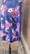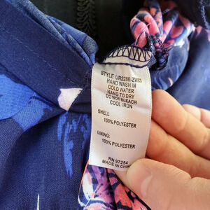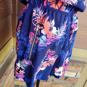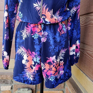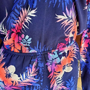 Size S blue and pink tropical print romper. Long sleeves with elastic wrists. Zipper in back. Two zipper pockets. Elastic waist. Waist 12in. Inseam 2.5in. Rise to elastic waist 13in.