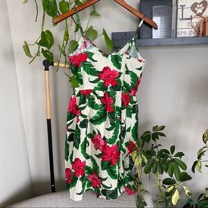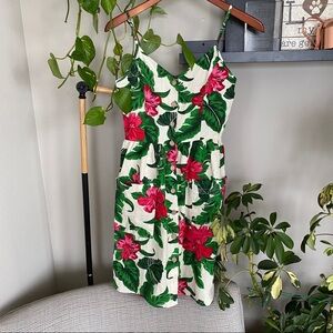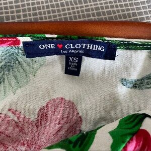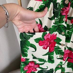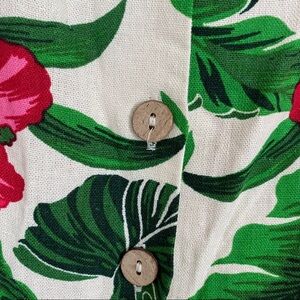 One Clothing Los Angeles tropical patterned linen dress. Buttons in front and cinches at waist with two front pockets!