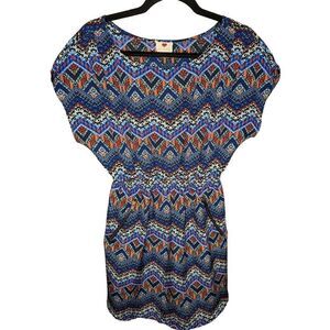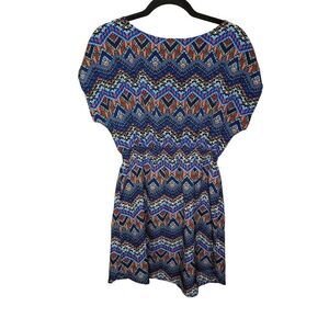 One Clothing Mini Dress Printed with Blue and Purple Tones with Striped Round Neckline and Cap Sleeves and Gathered Waist