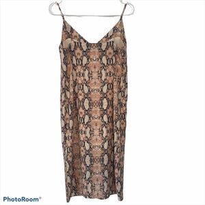 Snake print midi dress by One Clothing. Pearlized buttons down to approximately 9" from bottom of dress. Spaghetti straps. Dress is lined through buttoned area. 97% poly, 3% spandex. Size Small.