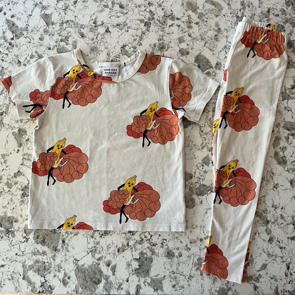 Loads of personality with dancing bananas on the AOP short sleeve tee and matching leggings.