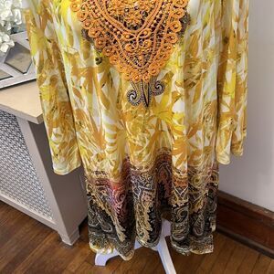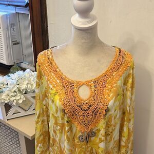 One Emerald yellow floral crocheted sparkle tunic Size XL EUC
