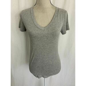 One Four Three 143 Womens Solid Light Gray V Neck Short Sleeve Top T Shirt Small. Shipped with USPS First Class Package. Length 24, bust 31, waist 30, hips 31. Measurements in inches. Perfect condition. No rips holes stains or fading. Smoke and pet free home. Fast shipping. Soft stretchy material.