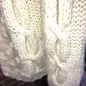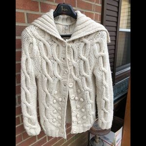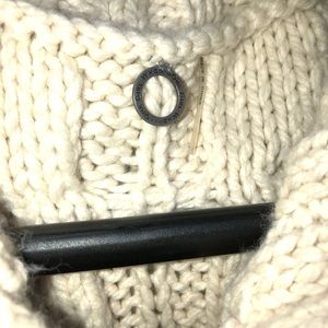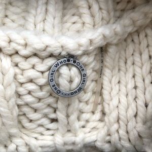One Girl Who Sweater in a Cream color, soft, comfortable, and warm. Size: Small. Measurements: Bust: 18; Length: 24; Sleeves: 25. Materials: 70% Acrylic, 30% wool, and has an additional button. Comes with its belt.