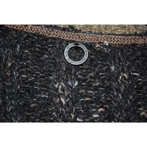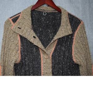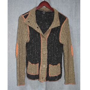 Unique and cozy knit cardigan by One Girl Who… featuring a warm two-tone colorblock design in tan and charcoal with orange accent stitching and elbow patches. Made from a textured wool blend yarn with button front closure, pointed collar, and patch pockets. This artistic, boho-inspired piece combines modern design with rustic charm — perfect for layering on cool days.
