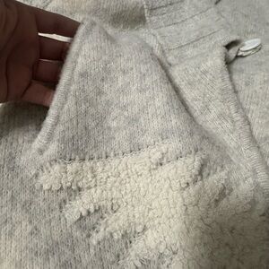 This elegant heavyweight wool blend cardigan features a soft, fuzzy texture and a sophisticated shawl collar, with pockets, perfect for adding a touch of style to any outfit. The long design offers warmth and coverage, while the geometric pattern adds a unique touch. Ideal for layering, this cardigan is both comfortable and chic.
