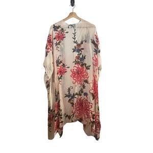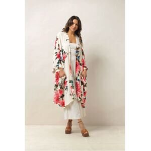 Keywords: One Hundred Stars kimono, chrysanthemum kimono, floral kimono, boho kimono, full length kimono, ecru floral robe, one size kimono, resort wear, statement layering piece, vacation outfit, lounge kimono.
