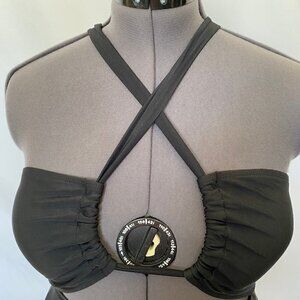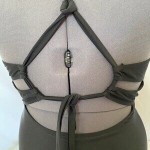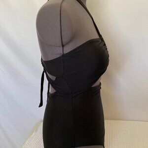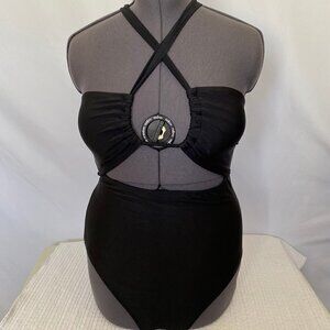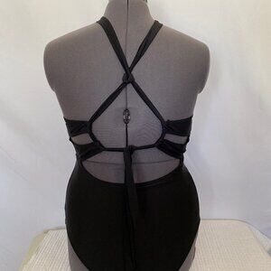 One Pc Black Faux Bikini Swim Bathing Suit...crisscross bra top...attached bottoms goes to waistline...appearance of 2 pc bikini...back of top is also crisscross design and bikini looking...straps tie in the back...NWOT...see photos for details...033022