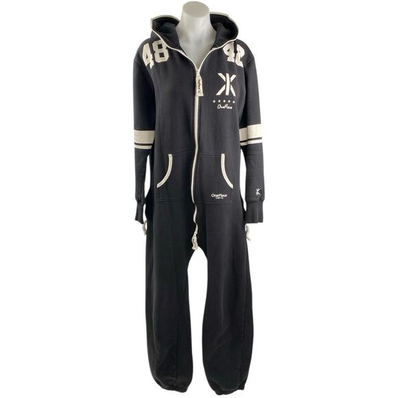 One Piece College 48 Black Hooded Long Sleeve Overall Bodysuit Romper Jumpsuit M
