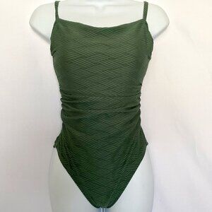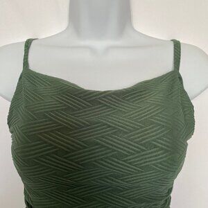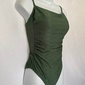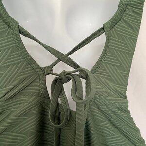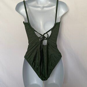 One Piece Dark Green Abstract Pattern Bathing Suit...Spaghetti strap bathing suit …..With a 3 layer cris cross bathing suit in the back ….. the bathing suit is Size small…With a Tan inside and bra padding for support….NWOT… 04/18/2022