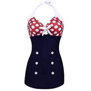 One Piece Plus Size XXL Navy Blue Red & White Vintage Style Halter Top Swimsuit