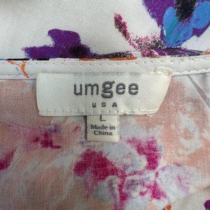 Floral colors pop with a beige background. V-neck top with button. Button could use to be re-stitched. Top is nice and flowy with comfortable shorts and pockets.
