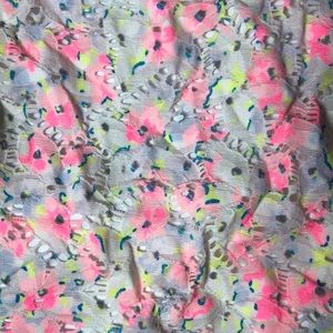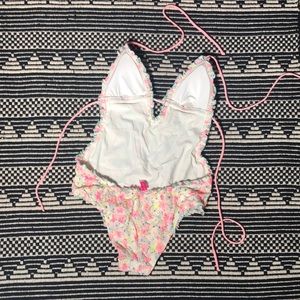 I have a beautiful floral one piece. The colors are light pink, light blue and hits of a light yellow. It has a open back and cuts lower in the front. It’s Victoria’s Secret.