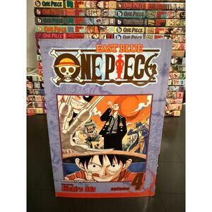One Piece Volume 4 from the East Blue saga follows Luffy and his crew as they face Captain Kuro and the Black Cat Pirates. This is an English Shonen Jump manga edition published by VIZ Media.