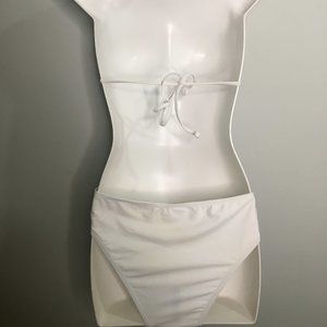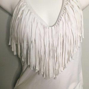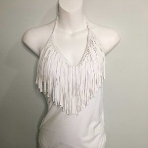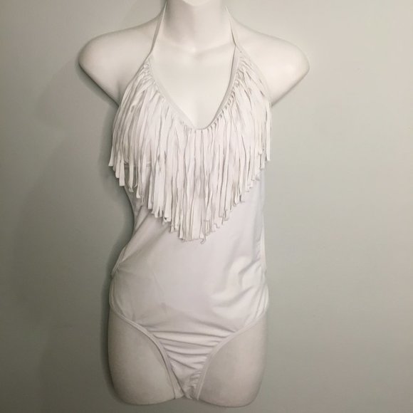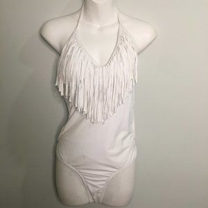 JVGrabs - One Piece White Swimsuit. Has minor light yellow on the left side tassles (like two strands). Really cute and flirty. Worn Once - Size - L - Condition: Used - Item# 89