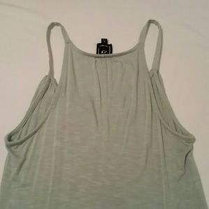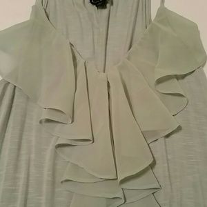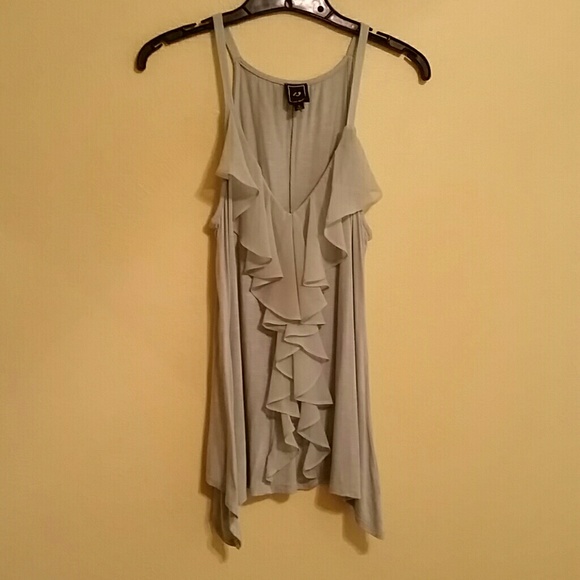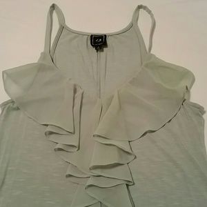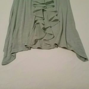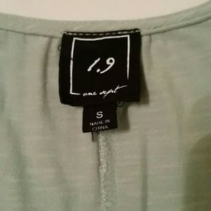 One Sept 1.9 v-neck tank top with ruffle in heathered mint green! So soft! The sides are longer than the center, both front and back. The measurement between the lowest part of the V and the bottom (center) of the shirt is about 16.5 inches. No snags or stains that I can find! Zoom in on pics for condition and ask if questions!