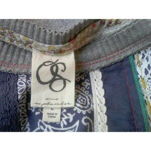 The One September Anthropologie Bandana Patchwork Grey Knit Top in size S is a stylish and comfortable addition to any woman's wardrobe. This casual top features a unique bandana patchwork pattern with embroidered accents, giving it a bohemian and eclectic look.