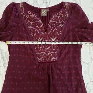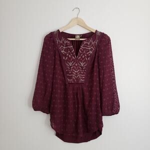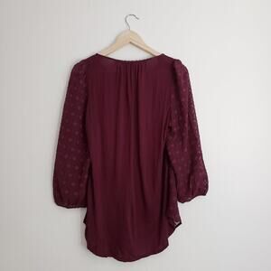 A beautiful cranberry colored tunic top in great condition without flaws. It has lovely beading near the neckline and patterned fabric on the front and sleeves.