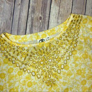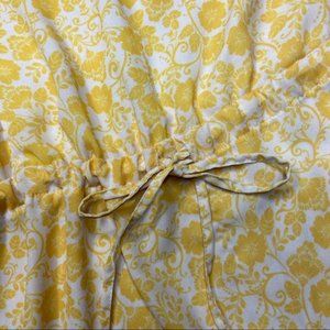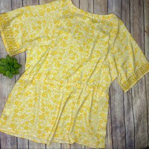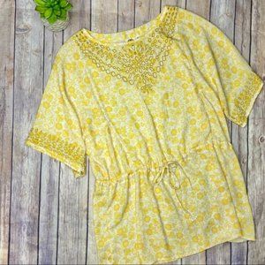 Drawstring waist, embroidered sleeves, open embroidery at neckline, floral print yellow and white peasant top.