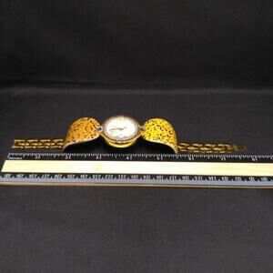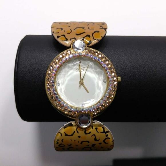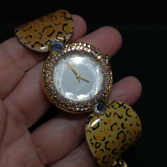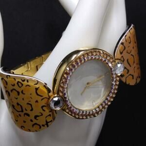*Description: This is a ladies watch with a rhinestone framed face. Beautiful faceted crystal. The band is rounded animal print plastic with a gold tone linked band. The watch back has "One Sheen" and three butterfly images. Stainless Steel back. Water Resistant.