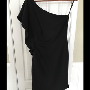 This off the shoulder dress is very fun and flattering. In perfect condition. It is one shoulder and has an amazing ruffle going down the side of the dress. I would say it is a little big for a two. I am usually a four and it fit me very comfortably. The fabric is made of 90 % polyester and 10 % spandex.