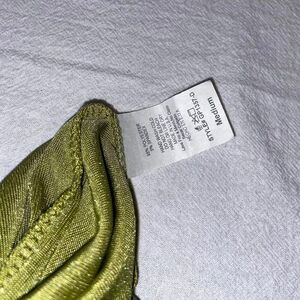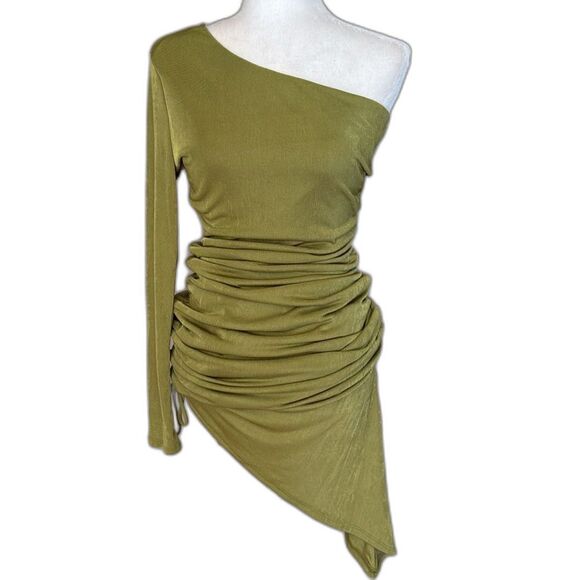 One shoulder asymmetrical green midi dress with rouching on the side. The material is a slinky stretchy style of material. New without tags, excellent condition, never worn.