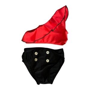 One Shoulder Baby Girl Swimsuit: Very cute swim suit features a one shoulder style with a ruffle neckline. Black bottoms with decorative button on the front.