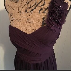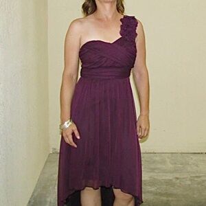Purchased from David’s Bridal, eggplant color, high/low, about knee length. Only worn once for a couple hours!