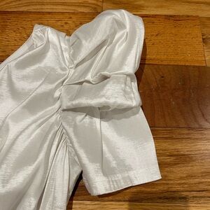 Very cute top with one shoulder out and the other with a beautiful puffed sleeve and it ties in a bow