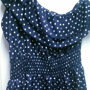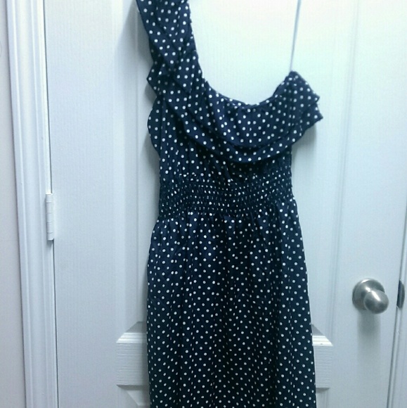 Cute boutique polka dot one shoulder dress. Hardly worn. Pet and smoke free home. Original owner. I'm 5'6" and it hits just above my knees.
