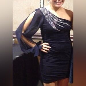 Fancy one shoulder ruched dress! One shoulder with a sheer sleeve. Only worn a few times, perfect for special occasions!