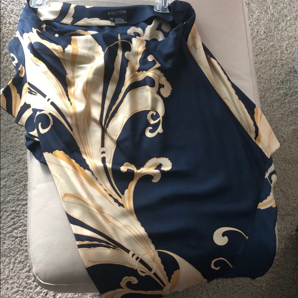 Classic one shoulder ruffle blouse with very flattering asymmetric hemline. EUC. Timeless navy/gold color combination, perfect with white jeans/linen or dress pants. Dress this one up or down!