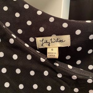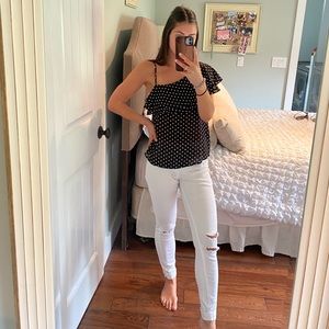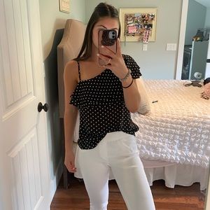 One Shoulder blouse with ruffle detail. The opposite shoulder has an adjustable strap