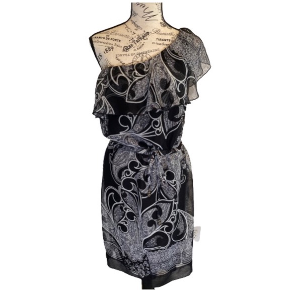 One shoulder ruffle dress with draw string waist. Lined.
