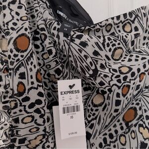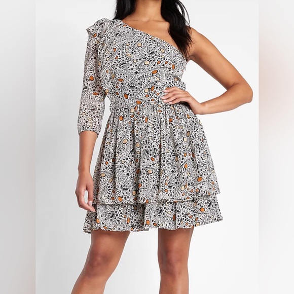 Stylish one-shoulder dress with a unique pattern. Features a blend of black, white, and orange colors for a bold look. Perfect for any occasion.