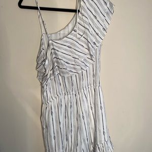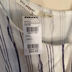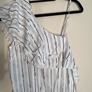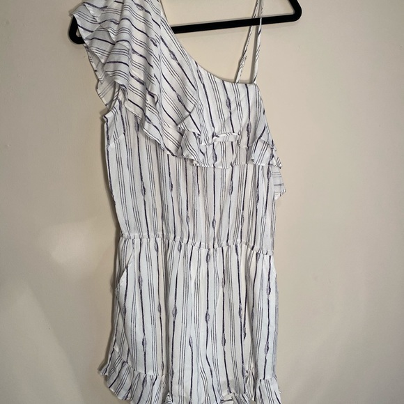 Brand new Tilly’s romper! Very cute one shoulder detail, and has adjustable strap on the other shoulder. Elastic waist and ruffles along the bottom of the shorts. Great quality fabric and such a cute look to throw on!