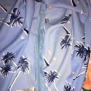 Baby Blue with navy blue palm trees. Open from left shoulder and left side zipper.
