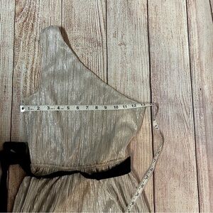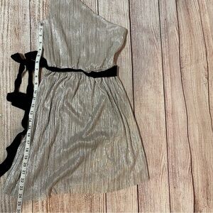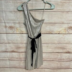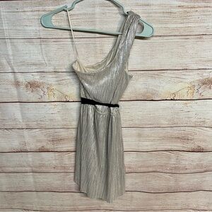 Beautiful and fun silver/champagne one shoulder pleated dress with belt. In excellent condition, no known flaws. Stretchable waist, fully lined.