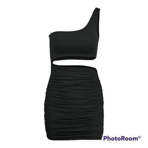 One shoulder, sleeveless, cutout, ruched sides, solid color, bodycon mini dress.