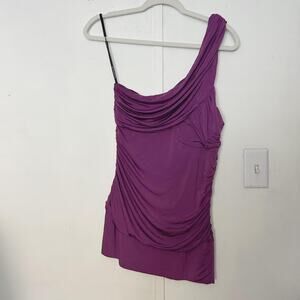 Purple sleeveless one shoulder asymmetrical tank top tunic with ruched accents at side. Super cute y2k, 2000s party club girl core.