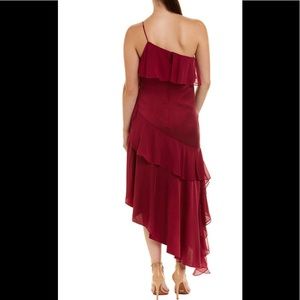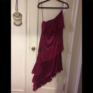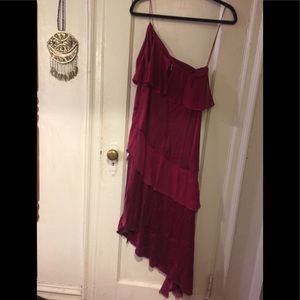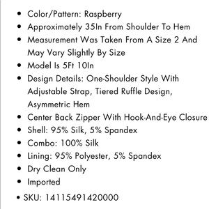 Stunning Raspberry One Shoulder Dress with tiered ruffle details. Silk blend Midi dress with Asymmetrical hem. Body is 95%Silk 5% Spandex with Silk Chiffon ruffles. Adjustable straps with back zipper opening.New with tags from pet free home.