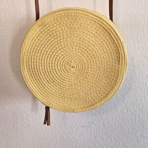 A sunny, round woven mini purse from Express in a buttery yellow tone. Features a structured circle shape, zip-around closure, and tan shoulder strap. Great for spring/summer looks.