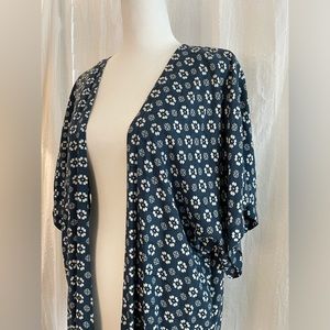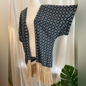 The perfect boho layer for festival season! This navy blue robe/kimono is OS and is lightweight and comfortable. 100% cotton, with a geometric floral pattern and fringe.
