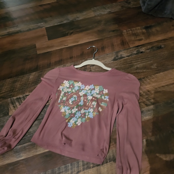 Charming pink long sleeve tee. Features a floral heart design with 'LOVE' text. Perfect for casual wear.