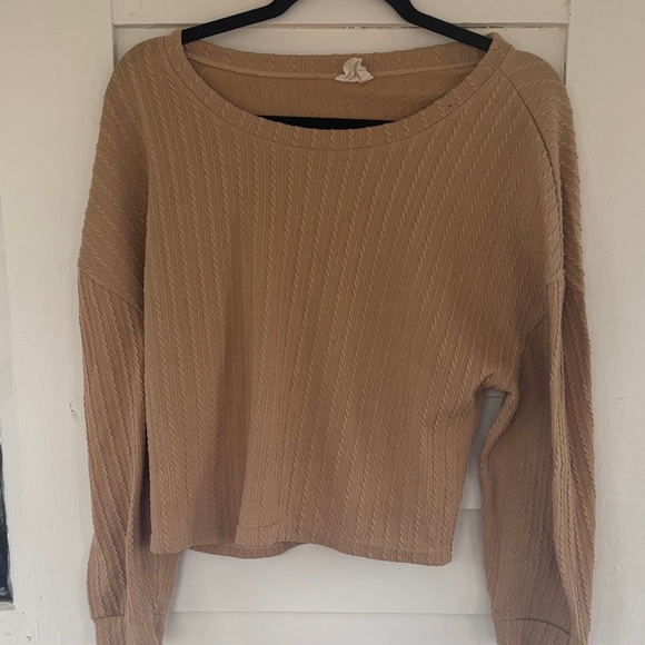 Ribbed knit crewneck with subtle texture. Neutral camel tone for versatile looks. Simple, classic silhouette.