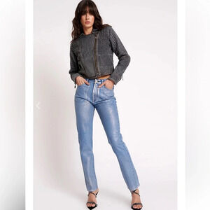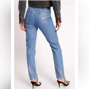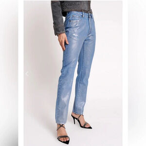 BLUE FUTURE is our new light weight fresh blue denim wash featuring a metallic silver coating.