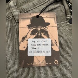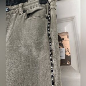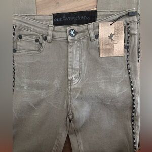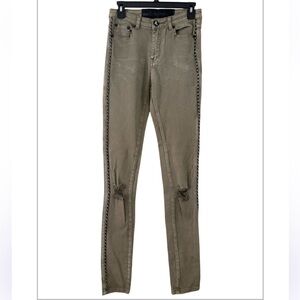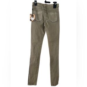 Light Army Green with black and white side trim. Distressed knee skinny jeans.