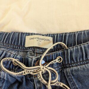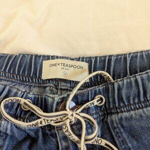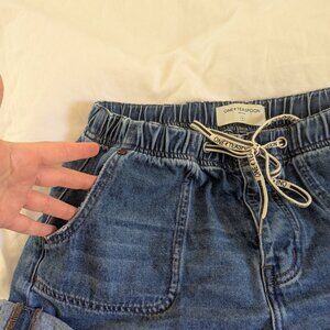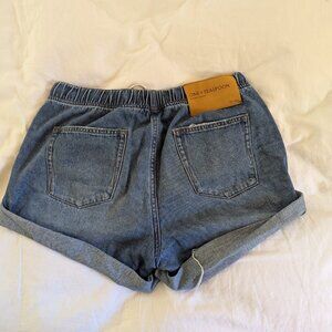 Stylish blue jean shorts. Rolled hem design. Comfortable fit with drawstring waist.